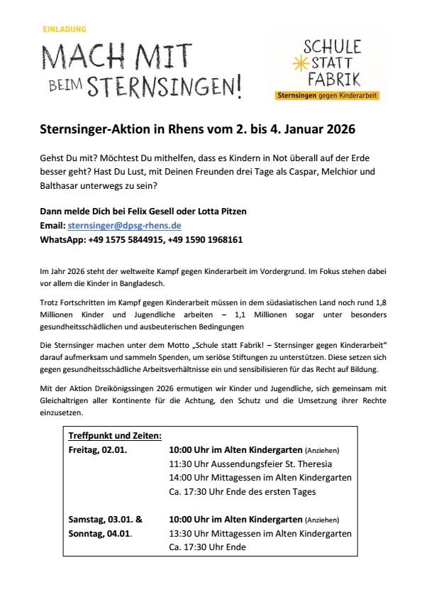 Ausführliche Informationen zur Aktion Dreikönigssingen 2026 sowie den neuen Sternsingerfilm von und mit Reporter Willi Weitzel finden Sie auf der Internetseite ->www.sternsinger.de
